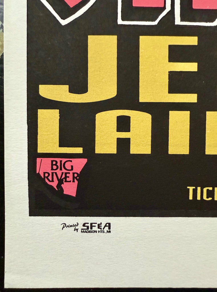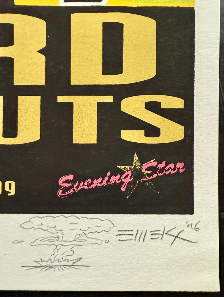 Another oldie but goody here from Emek’s early days. This one is for Ministry’s 1996 performance at the Albuquerque Convention Center. The poster measures 34” x 22”. Like all early Emek’s pre-2003 they are not numbered though it is widely estimated that 300 copies were produced. Emek has signed, doodled & dated this one. The condition is near mint minus with two bends in the bottom.