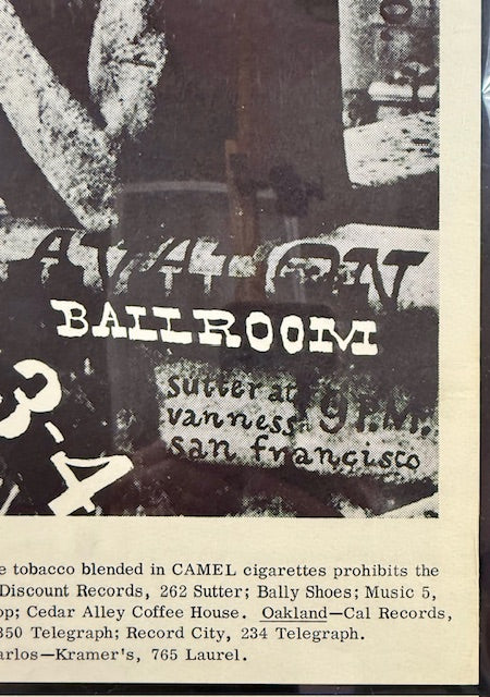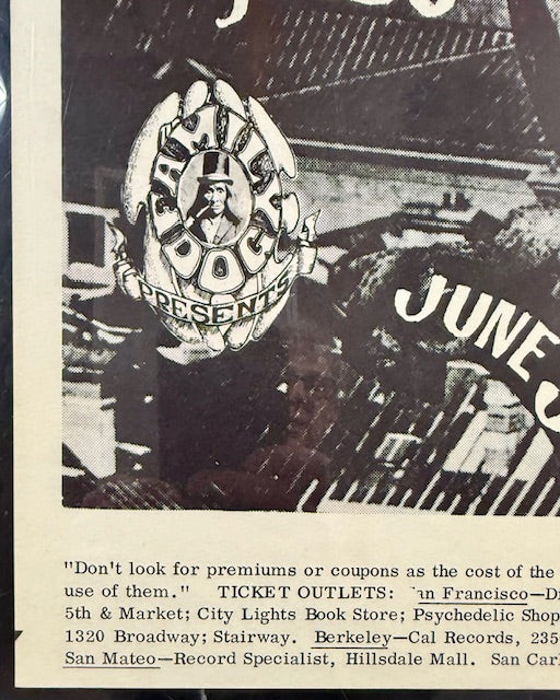 This poster was the first Family Dog poster designed by Victor Moscoso, and is known as the “Stone Facade.” This original poster was printed on white vellum in gray and black ink. It measures approximately 13 1/2" x 20".
