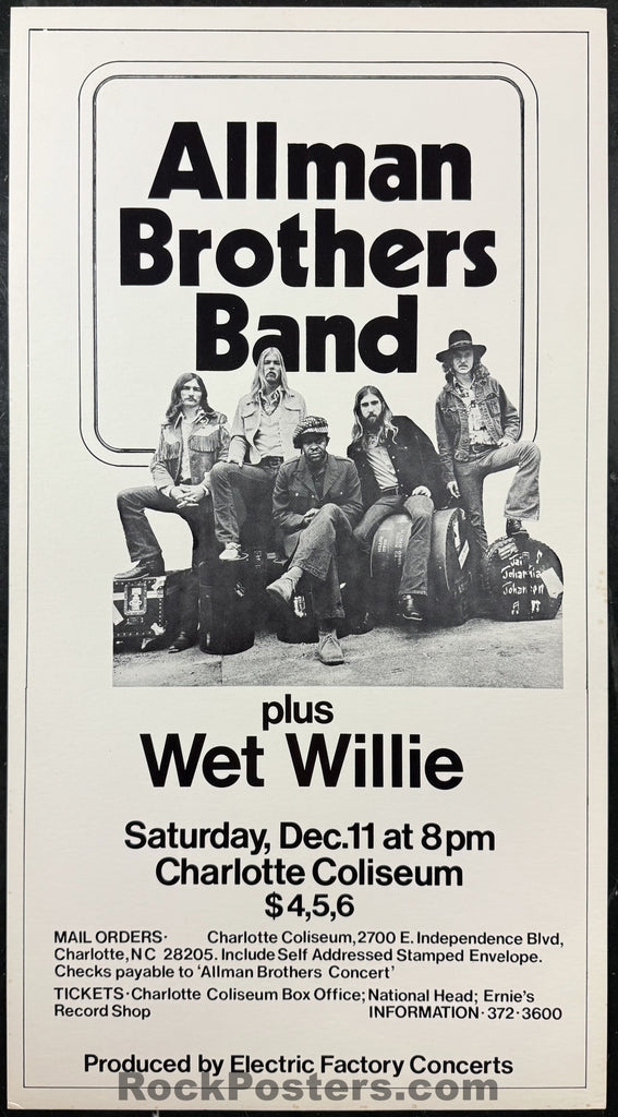 AUCTION - Allman Brothers Band - 1971 Board Poster - Charlotte, NC - Near Mint Minus