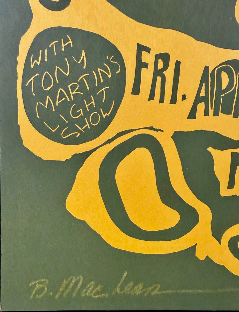 Here is a very curious poster designed by Bonnie MacLean before she got her full-time gig in 1967 as a Fillmore poster artist. Bonnie designed this poster in her chalkboard style that she used in the early days of the Fillmore Auditorium for a concert featuring the Quicksilver Messenger Service and the Grass Roots. The poster is known as BG-0, although the date fell between the BG 3 & BG 4 concert dates. The poster was printed in two versions. A thick stock and a thin stock. This is the thin stock version. Bonnie MacLean has signed this poster in the lower left! It measures 18” x 12 5/8”. The poster is in near mint condition with light handling.