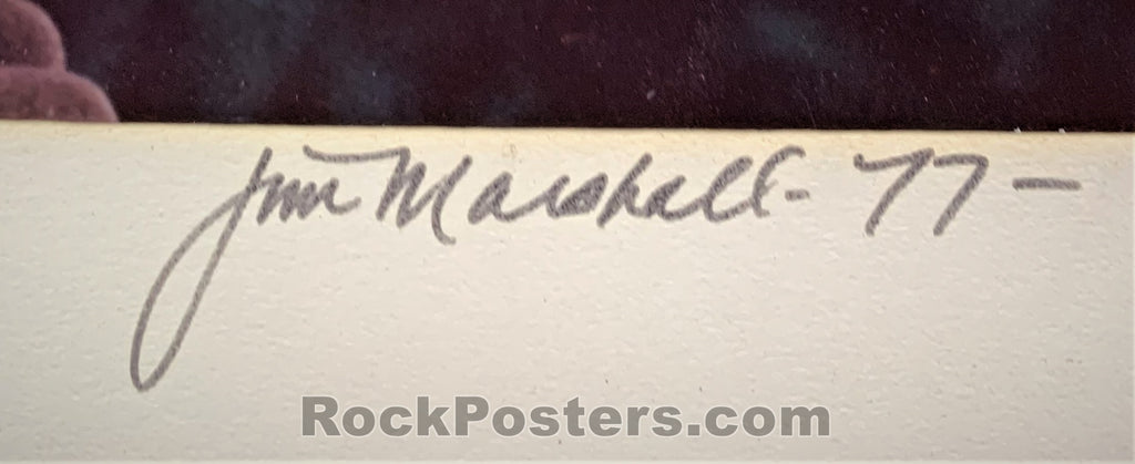 The photograph is dry-mounted on a 20" x 27" whiteboard. It is signed by Jim Marshall and dated (1977), with additional annotations on the mount. The piece is in excellent condition, although there is some toning along the edges of the artboard. Jim Marshall's signature can be found in the lower right corner of the photograph.