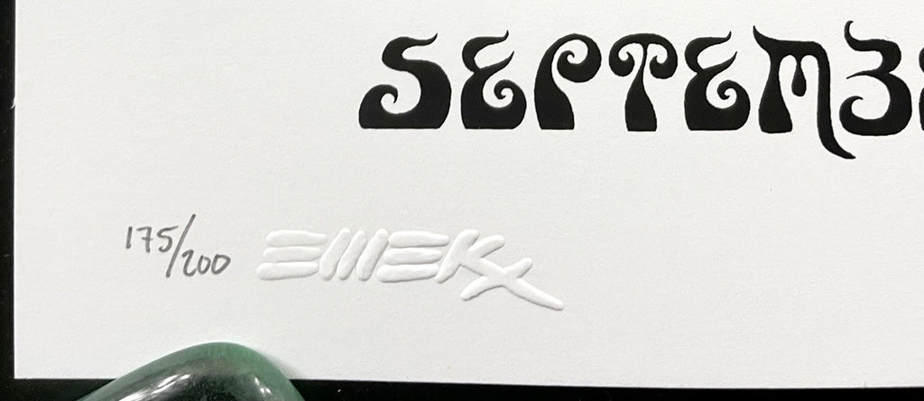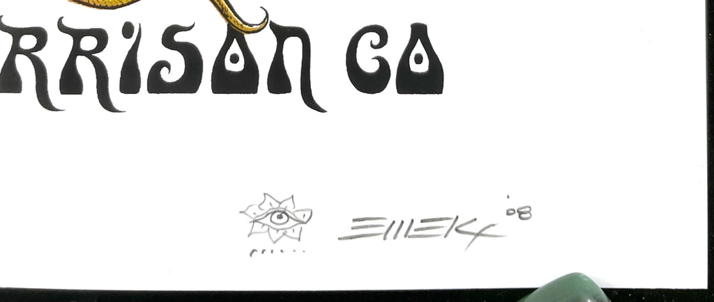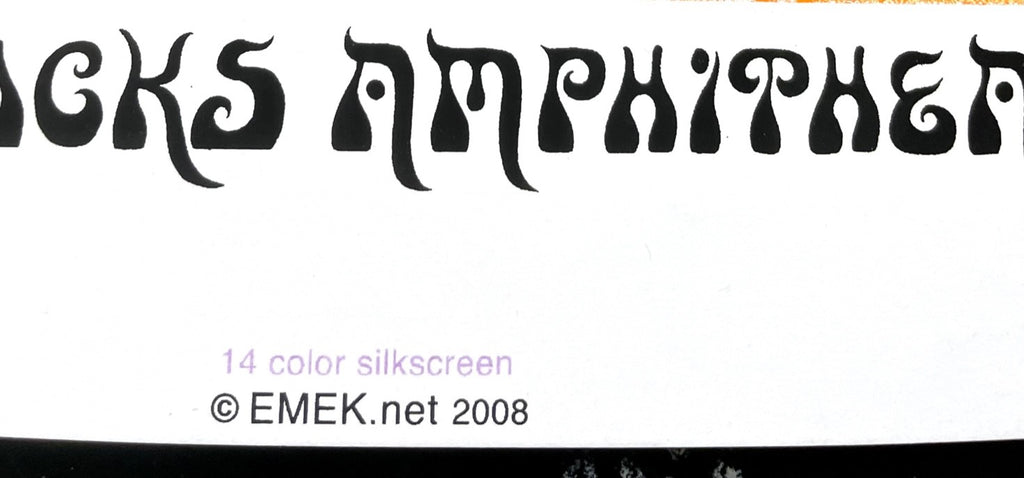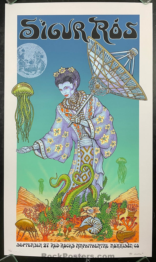 Here is Emek’s stunning 14-color silkscreen poster for Sigur Rós’ 2008 performance at Red Rocks in Morrison, Colorado. This is the first edition, limited to 200 copies. The poster measures 33” x 19”. Emek has signed, numbered, doodled on, and embossed the poster. The condition is near mint with light handling.