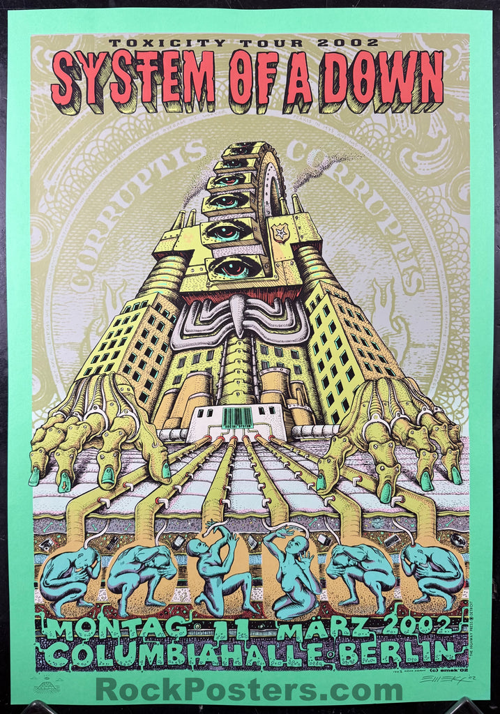 Here is a very popular Emek silkscreen for System of a Down's 2002 performance at the Columbiahalle in Berlin, Germany. This is the rare green variant edition. The poster measures 20" x 28". You will find the poster in the Art of Modern Rock as image AoMR 0.495. It has been signed and doodled on by Emek. The condition is near mint.