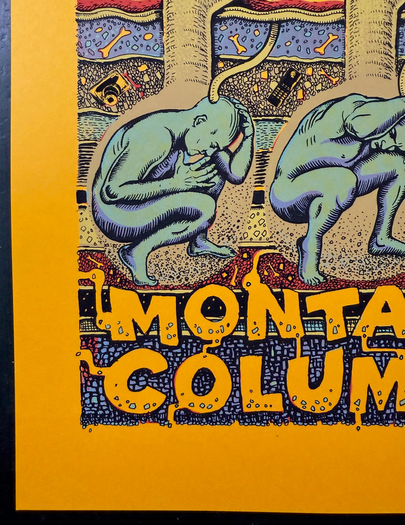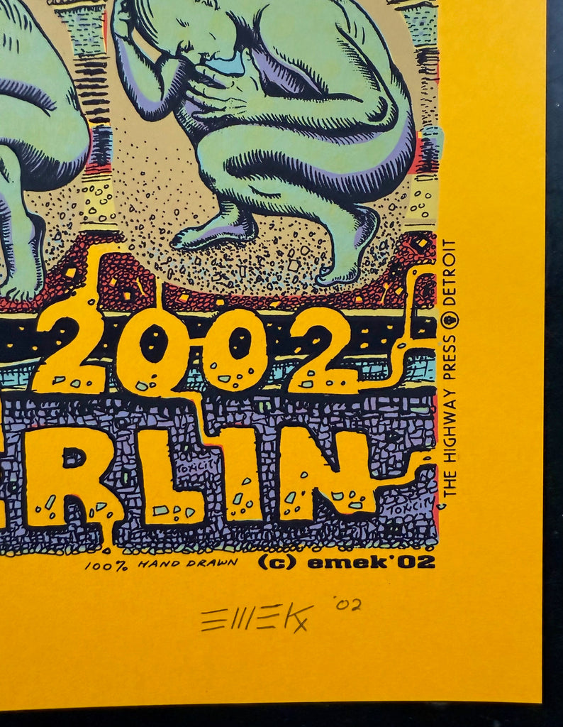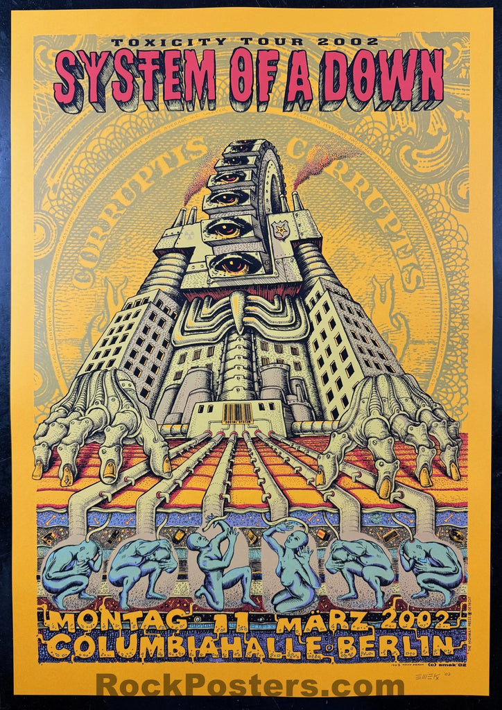 This is a sought-after Emek silkscreen poster for System of a Down's performance at Columbiahalle in Berlin, Germany, in 2002. This is the rare yellow variant edition. Although the poster is not numbered, we estimate that only six copies exist. The dimensions of the poster are approximately 28" x 22". You can find it listed in "The Art of Modern Rock" as image AoMR 0.495. This edition has been signed and dated by Emek. The condition of the poster is near mint.