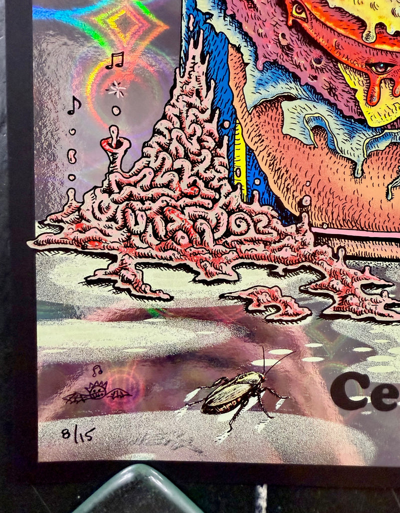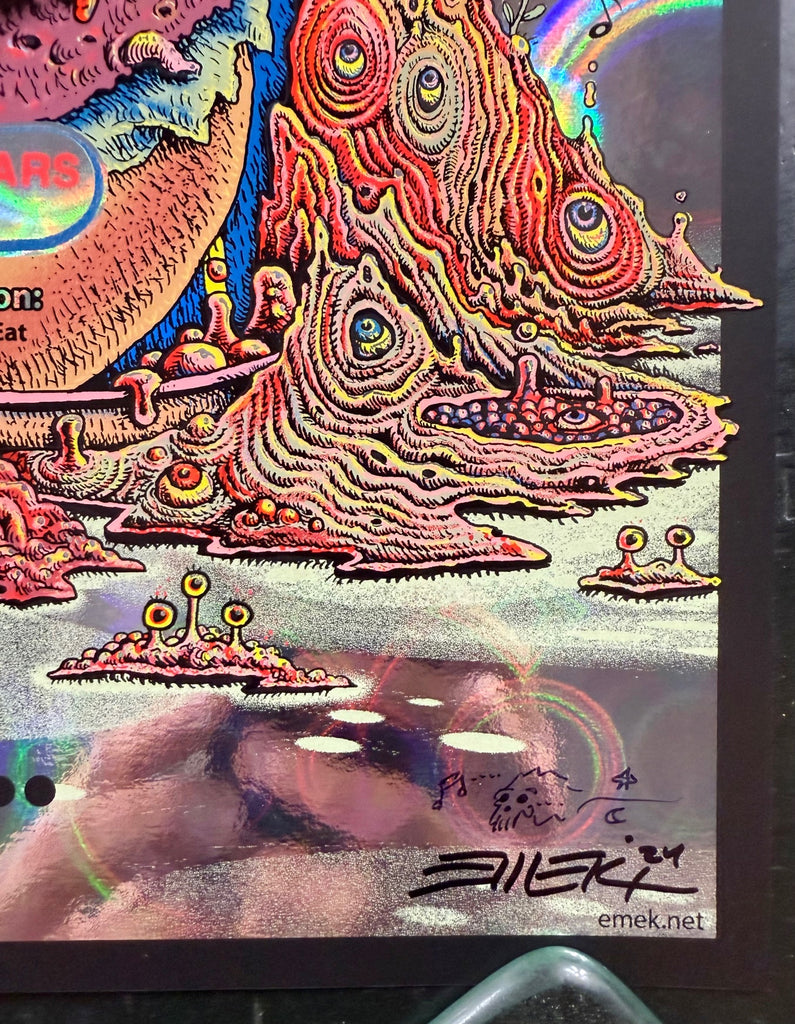 Here’s a remarkably creative silkscreen by Emek for Ween’s cancelled performance in Philadelphia, Pennsylvania. This is the circle foil variant. Emek produced only 15 copies of this edition. The poster measures 24” x 18”. Emek has signed, numbered, doodled and embossed this edition. The condition is mint.