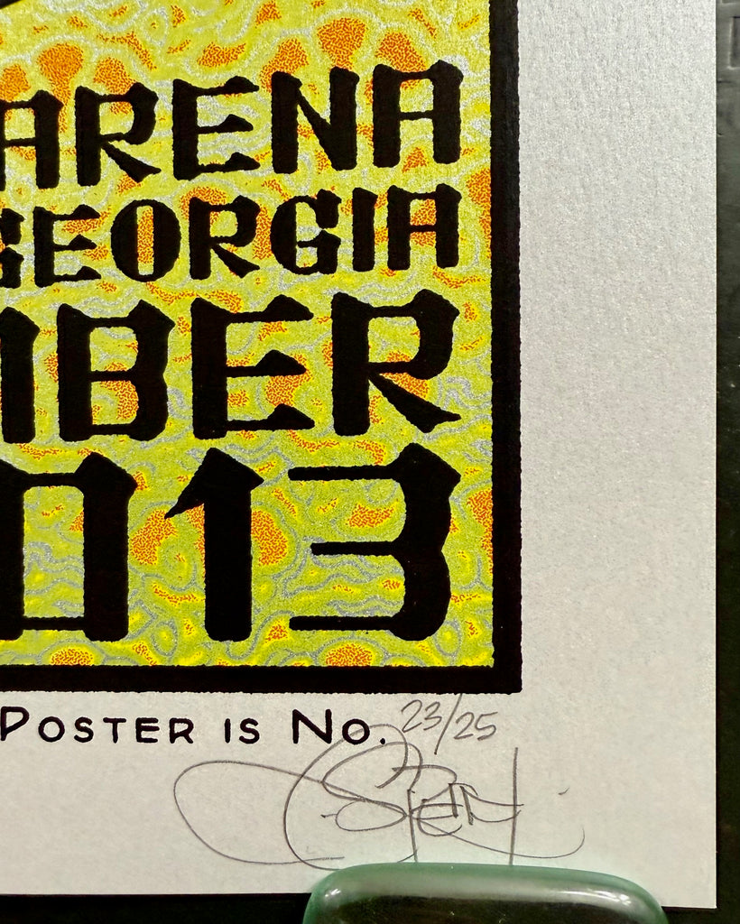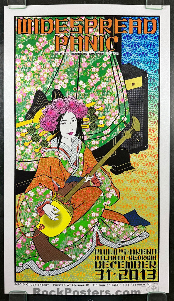 Here is Chuck Sperry’s 6 color silkscreen for Widespread Panic’s 2013 New Year's Eve performance at the Philips Arena in Atlanta, Georgia. This is the silver variant, from an edition of 25. The poster measures 35” x 20”. It has been signed & numbered by Chuck and remains in mint condition.