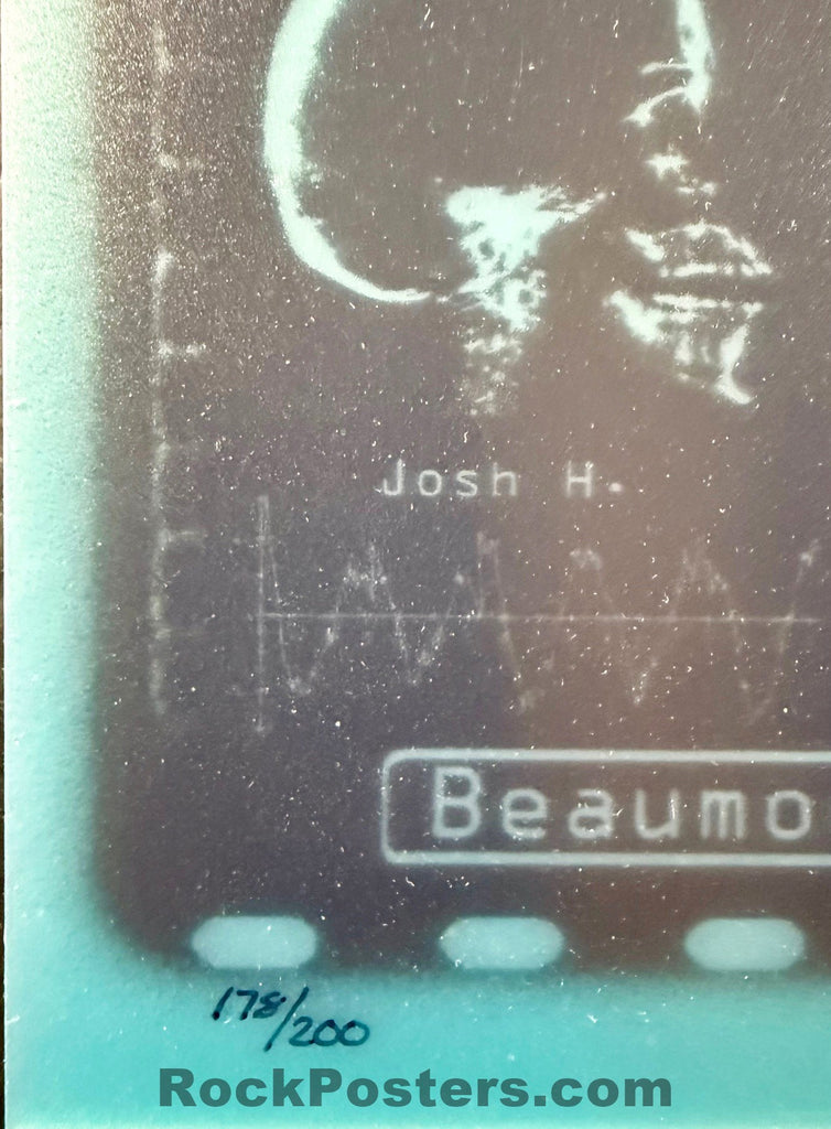 Here is a creatively designed silkscreen poster by Emek for the Queens of the Stone Age’s performance at the Beaumont Club in Kansas City, Missouri, in 2011. Emek used a plastic filament-type stock to achieve an X-ray image effect. This is the first edition of 200. The poster measures 24” x 17” and comes signed, numbered, and doodled by Emek. The condition is mint.
