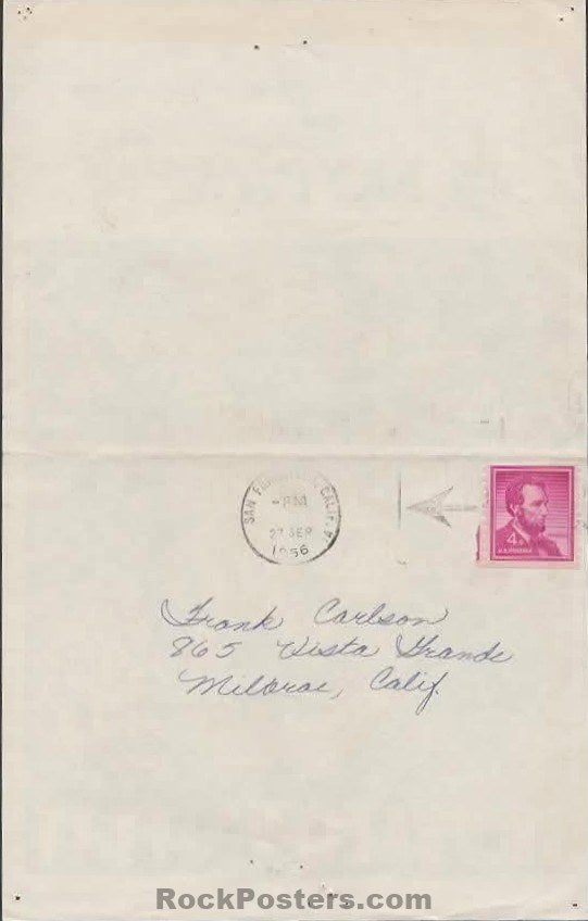 Condition: Excellent. It is machine-folded as issued and has pinholes in each corner as well as at the top and bottom center. There is a name and address written in pen, along with a postage stamp. This piece is a must-have for any complete Family Dog handbill collection.