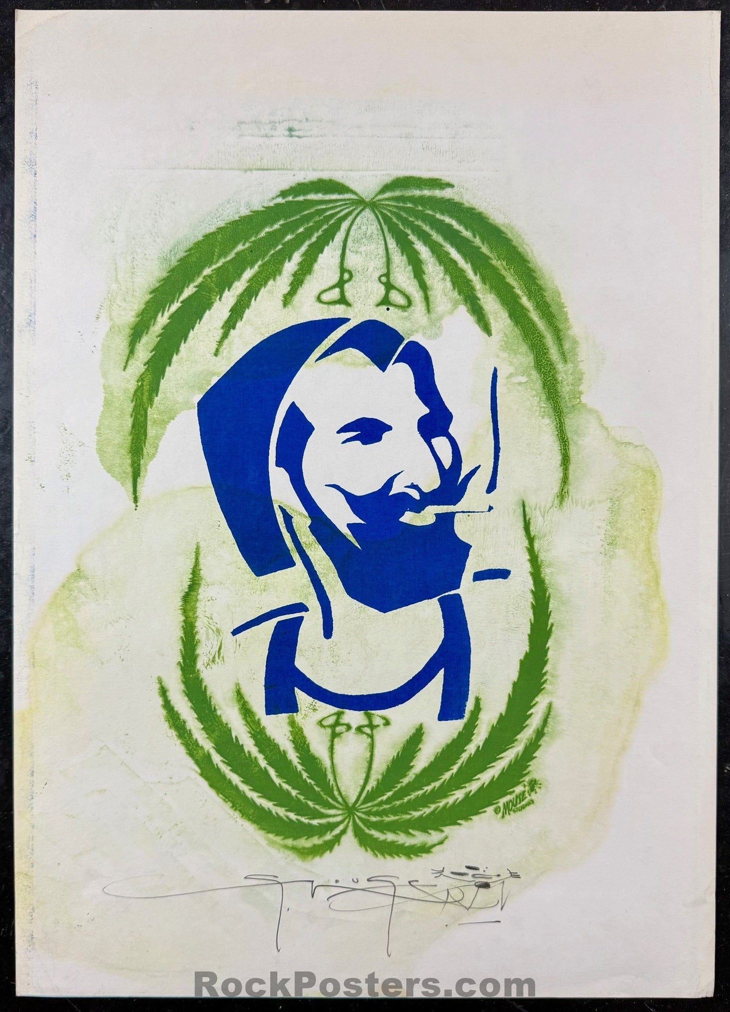 We are excited to offer this one-of-a-kind item. On one side, it features FD35 as a progressive proof with no red ink. Stanley Mouse has hand-signed it in pencil at the bottom of the central white space. On the reverse side, you'll find an image of the famous Zig-Zag Man surrounded by pot leaves, which is also hand-signed by Mouse in pencil across the bottom. This piece provides two different images and two signatures—an incredible find!