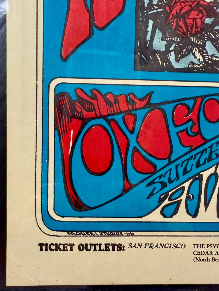 The original poster was printed on vellum and measures approximately 14″ x 20″. The notation “The Bindweed Press San Francisco” appears immediately above the right side of the ticket strip. Many originals show some degree of over-inking.