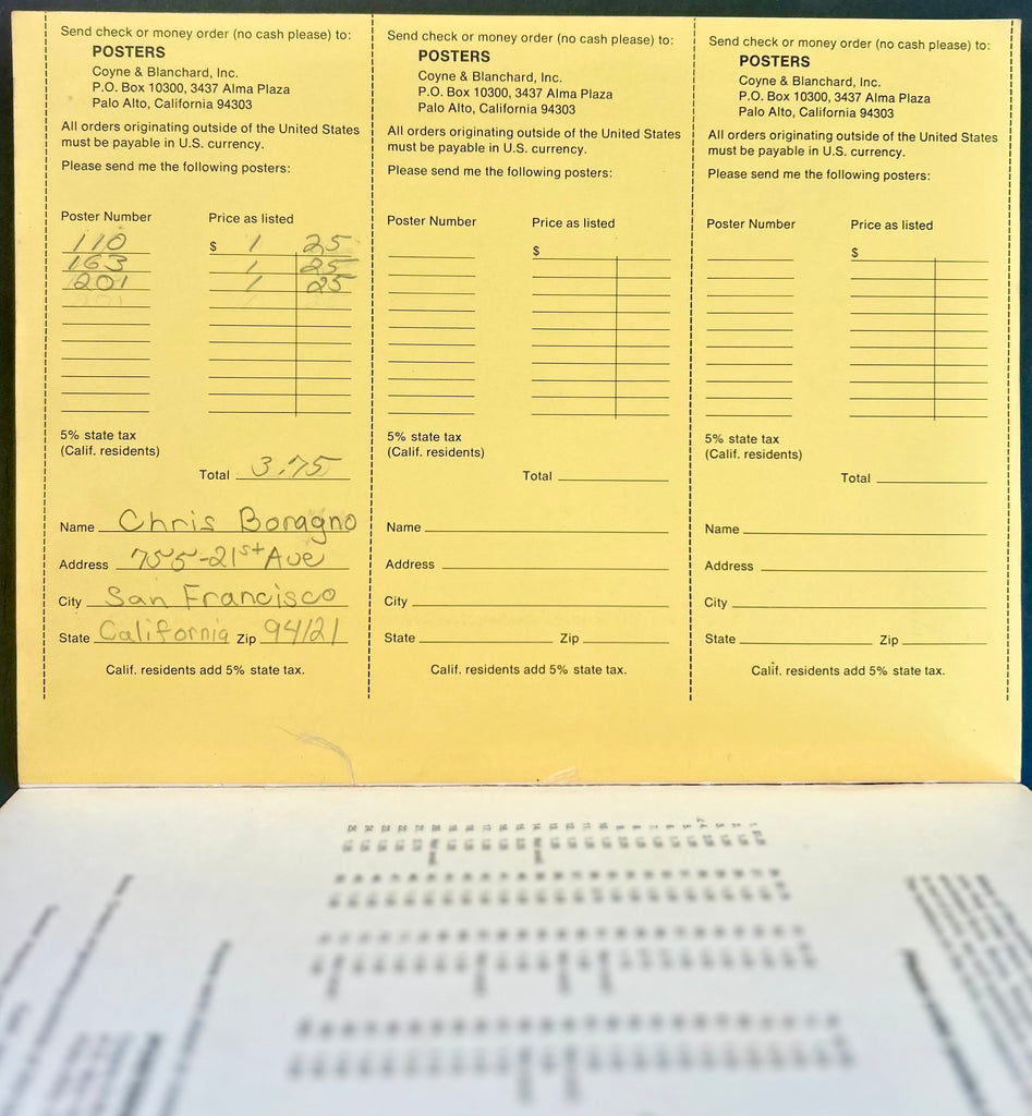 Here is the original Old Testament to rock poster art. Published in 1968 by Coyne & Blanchard of Palo Alto, California, The Great Poster Trip: Art Eureka is the first publication solely dedicated to 1960's psychedelic poster art. It is a must-have for any collector. The book is 79 pages and features over 200 images, 30 of which are in full color and many in full-page size. This softbound edition measures 11" x 8 ½”. It features a trippy cartoon cover designed by the late Rick Griffin. The book is in excellent condition with no missing or dog-eared pages. In fact, this one still has the order form attached, partially filled out by a resident of San Francisco to purchase the posters most of which are priced at $1.25. A serious must have for collectors of psychedelic poster art.
