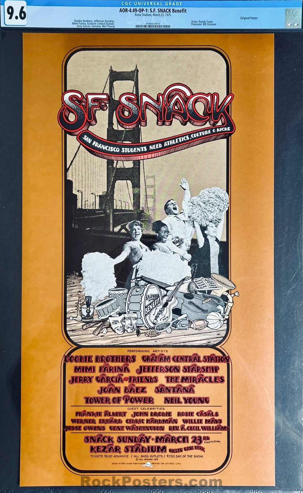 Here is a Bill Graham production entitled S.F. SNACK, a benefit for San Francisco public school students. A very cool poster was designed by Fillmore artist, Randy Tuten and featured in the Art of Rock as plate AOR 4.49. The benefit event featured the Grateful Dead, Neil Young, Santana, the Doobie Brothers, and many more. This is the original 1st print poster measuring 21" x 11 3/4". It's CGC Graded 9.6.