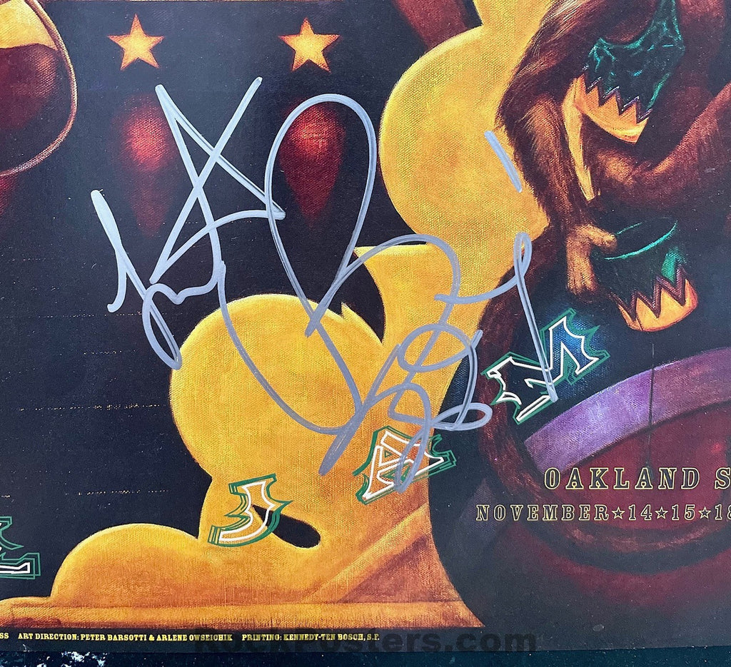 This is a classic original concert poster for the Rolling Stones, featuring their performance at Oakland Stadium, alongside Pearl Jam, on November 14-15 and 18-19, 1997. What makes this poster especially significant is that it is hand-signed by the legendary Charlie Watts, the band's drummer for 50 years. He signed it in silver pen in the bottom right corner. The artwork is by Randal Chavez, and this poster is identified as BGP180.