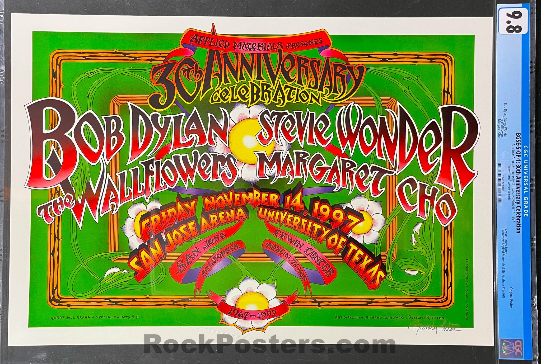 AUCTION - BGSE-5 - Bob Dylan - Stevie Wonder - Randy Tuten Signed - 1997 Poster - San Jose Arena - CGC Graded 9.8