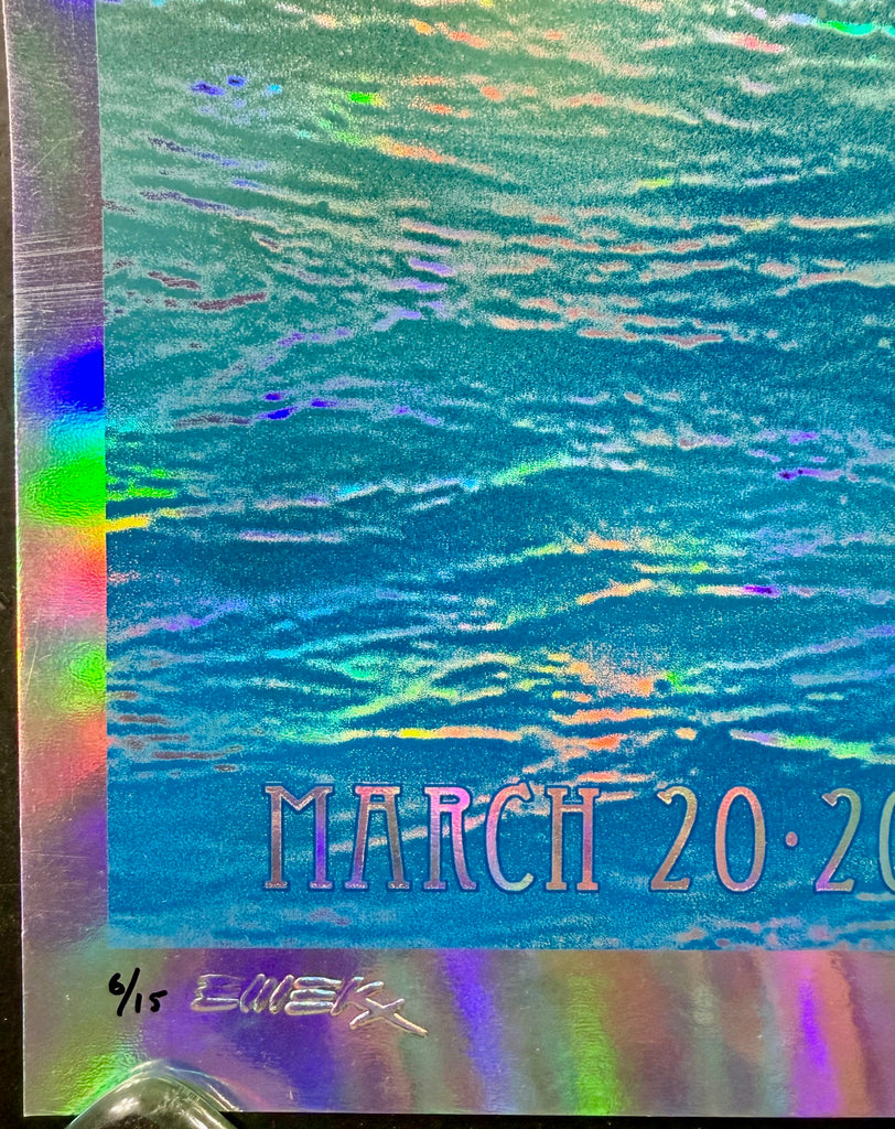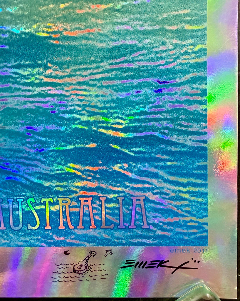 Here is Emek’s silkscreen poster for Eddie Vedder's 2011 performance at the State Theater in Sydney, Australia. This is the foil edition, which consists of a limited print run of just 15 copies. The poster measures 18 1/16" x 24.5”. Emek has signed, numbered, doodled, and embossed this edition. The condition is near mint minus, with a slight wave in the lower part of the poster.