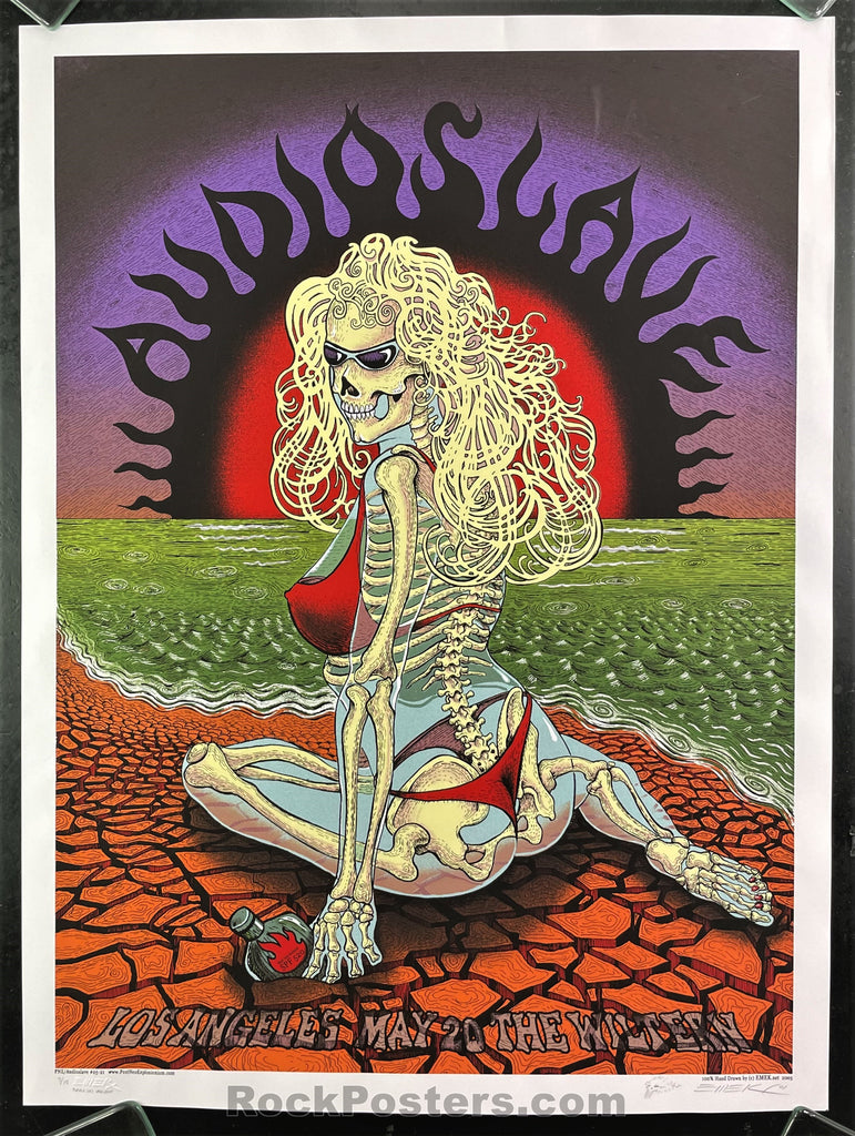 Here is Emek’s Black Hole Sunblock silkscreen for Audioslave’s 2005 show at the Wiltern Theatre in Los Angeles, California. This is one of Emek’s more desirable images. Offered here is the purple sky variant. Emek produced only 15 copies. The poster measures 32” x 24”. Emek has signed, numbered & doodled the poster. The condition is excellent with a handling bend in the upper center.