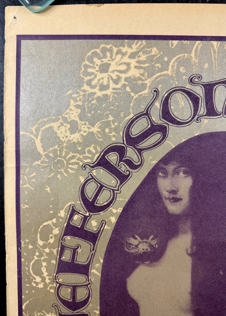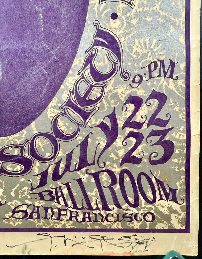 This is a very rare, early original concert poster from the Family Dog series. The bands featured are Jefferson Airplane and the Great Society, which included Grace Slick just a few months before she joined Jefferson Airplane. The design is fantastic, created by Stanley Mouse and Alton Kelley. Known as FD-17, this poster is dated July 22-23, 1966, and represents an early moment in the psychedelic scene in San Francisco, California. The venue is the Avalon Ballroom. Stanley Mouse has signed this poster in pencil.