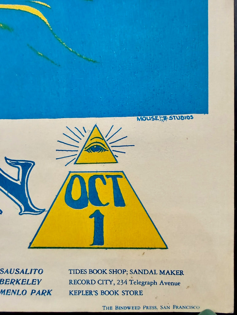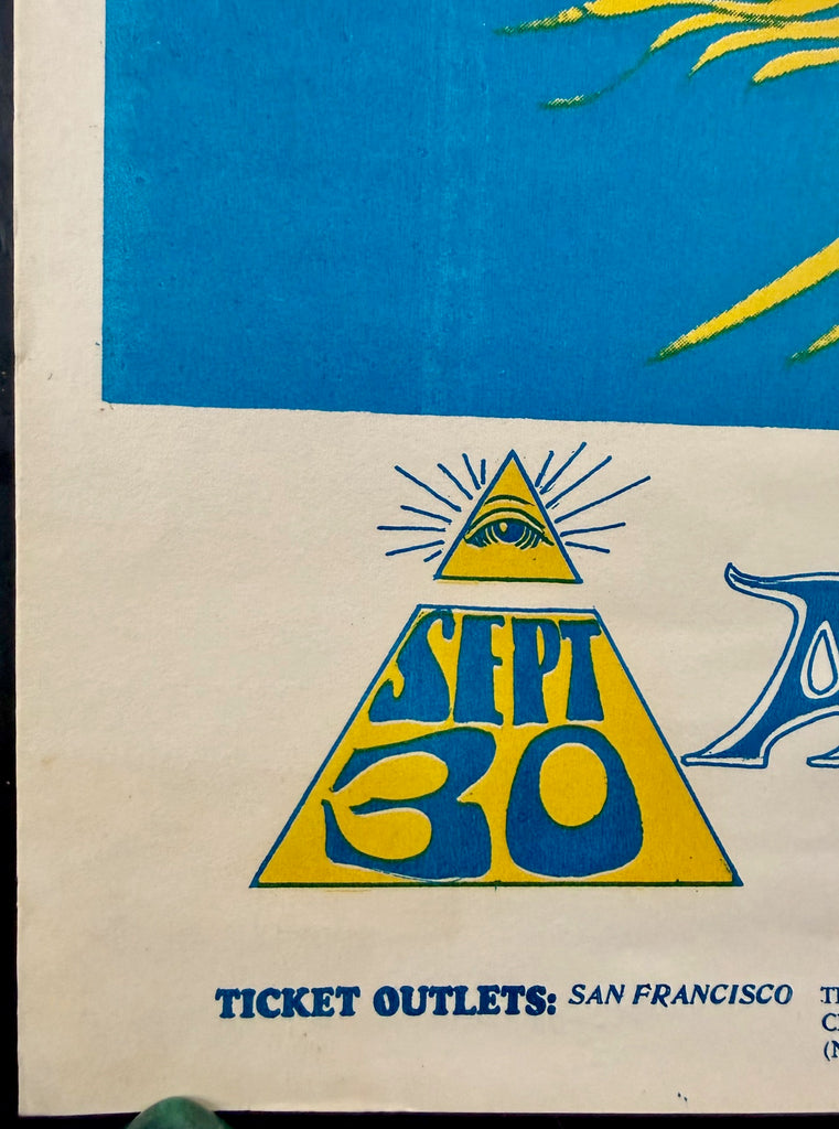 Here is an absolute classic, original concert poster from September/October 1966, featuring the great Texas psychedelic band, The 13th Floor Elevators, and local favorites, Quicksilver Messenger Service. The design is by Stanley Mouse & Alton Kelley. This is FD-28 in the Family Dog poster series.