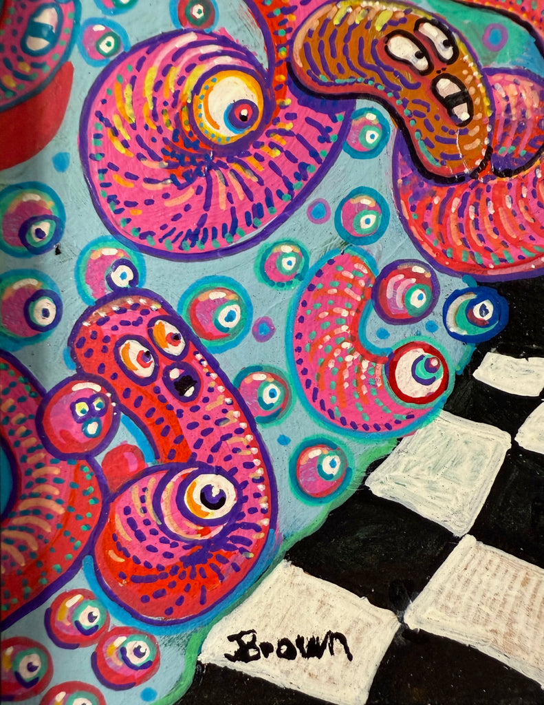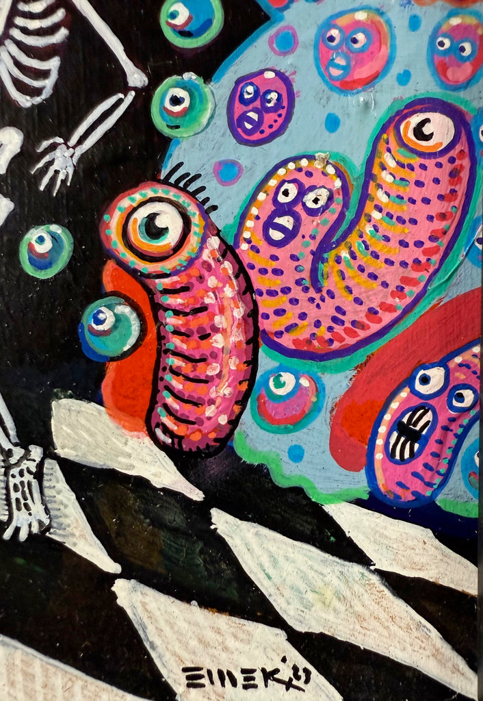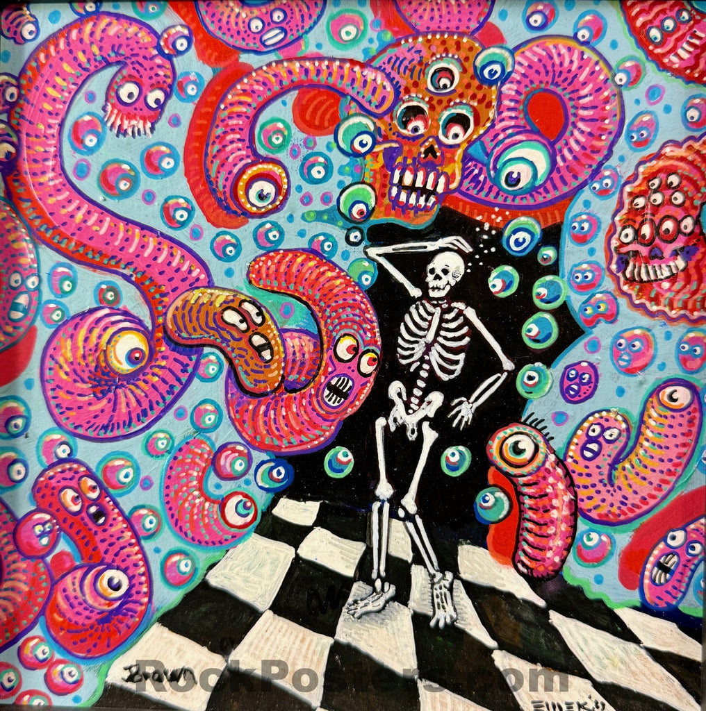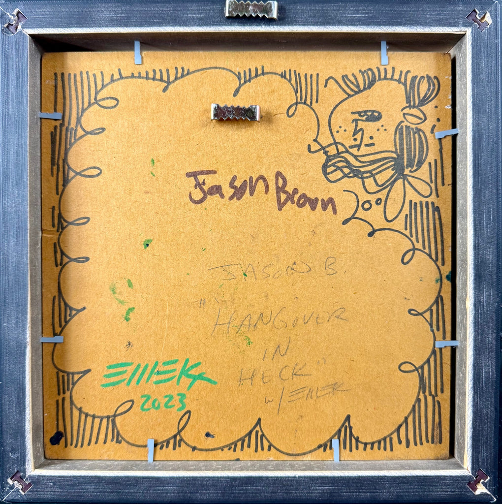 This is a curious collaboration between Emek & artist Jason Brown. It is entitled Hangover in Heck. This is a small art print measuring 10” x 10”. It is an original painting! It has been signed by both artists. The condition is mint.