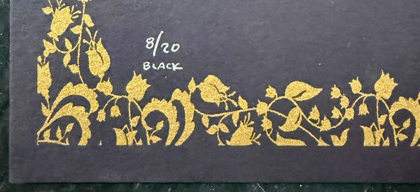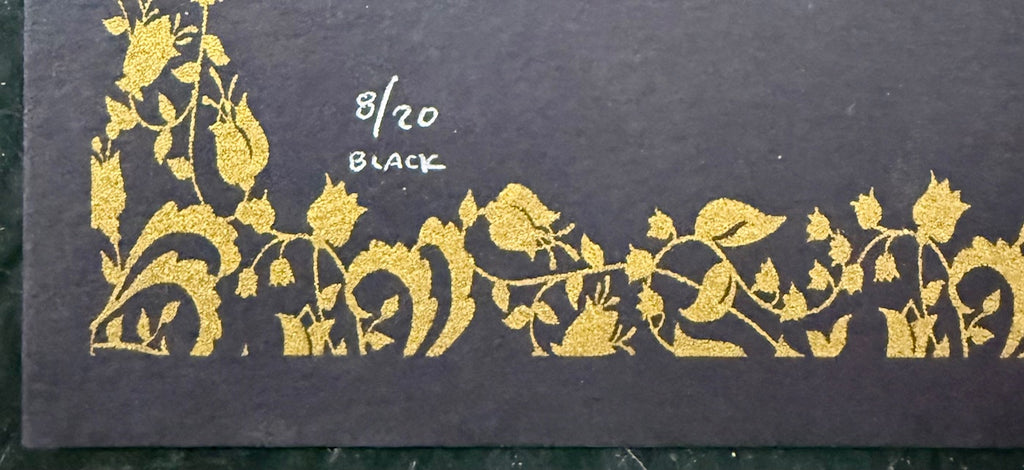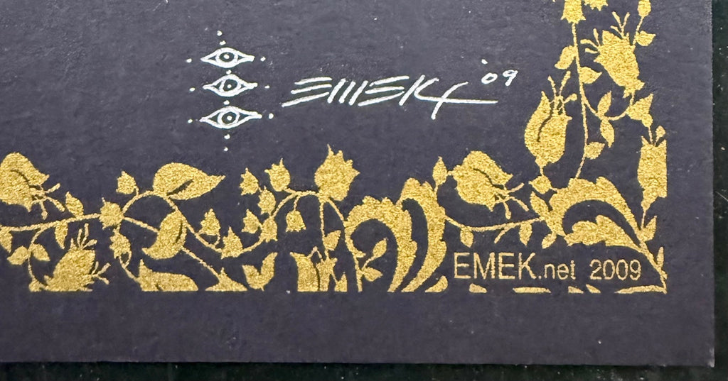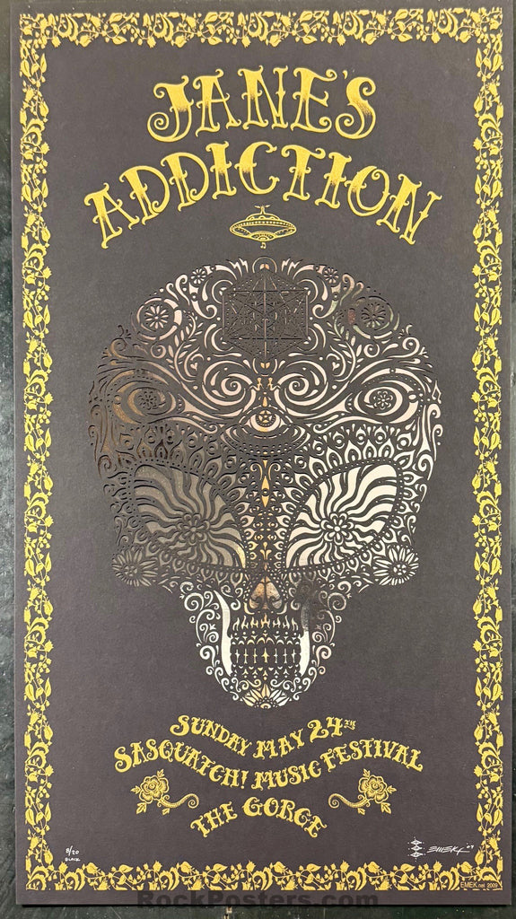 Here is a unique and sought-after laser-cut silkscreen poster for Jane’s Addiction's 2009 performance at the Sasquatch Festival, held at The Gorge in Washington State. This listing features the black variant, of which only 20 were produced by Emek. The poster measures 13” x 24” and is signed, numbered, and doodled by the Emek. Its condition is mint.