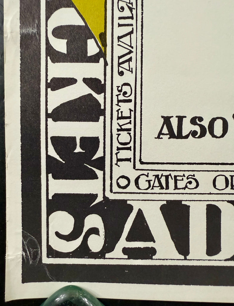 The poster is in very good condition, with handling bends throughout, a one-inch tear in the upper left edge that has been sealed on the back with clear tape. Additionally, there are three tape stains on the back. The poster measures 17" x 22".