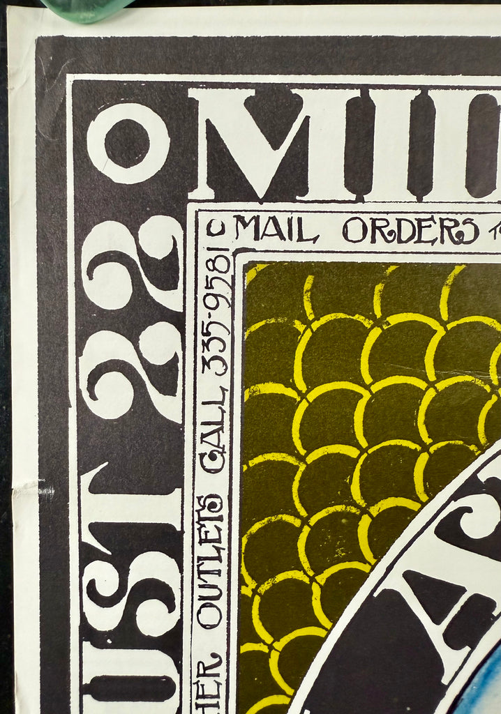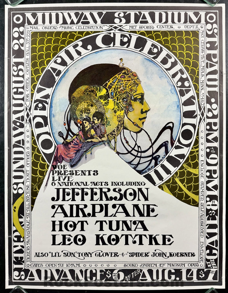Here is an original concert poster for an "Open Air Music Celebration" featuring Jefferson Airplane, Hot Tuna, and Leo Kottke. The event took place at Midway Stadium in Saint Paul, Minnesota, on August 22, 1971. Other performers included "Li'l Sun" Tony Glover and "Spider John" Koerner. This beautiful piece is printed on thin stock.