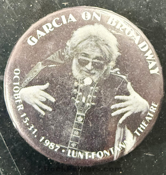 Also included in this lot is a pinback button for "Garcia On Broadway," from Jerry's Halloween shows at the Lunt-Fontanne Theatre in New York City, running from October 15 to 31, 1987. The button is in near mint condition, with some patina on the back, and measures approximately 1 1/2" in diameter.