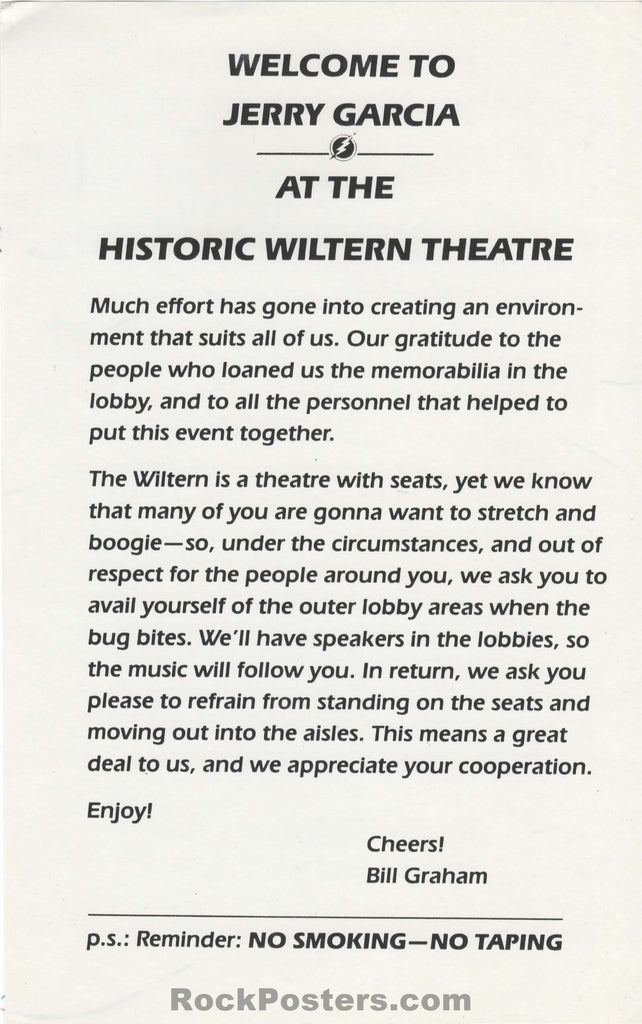 Here is a program for the Jerry Garcia Band electric concert from 1986 at the Wiltern Theater in Los Angeles. It is from LA Magazine, dated May 24, 1986, and comes with a single-page handout from Boll Graham. The program is in excellent condition, with some handling bends at the top center, and it measures 5 1/2″ x 8 3/8″.