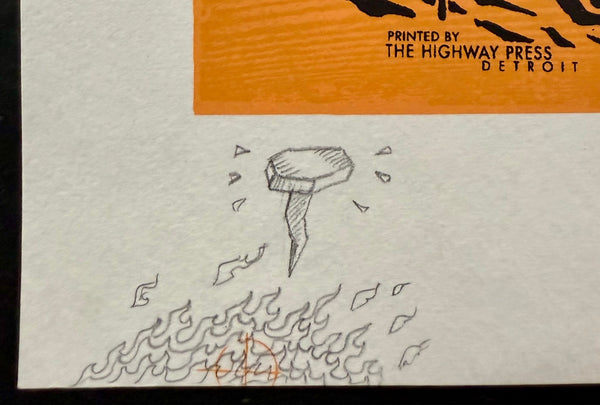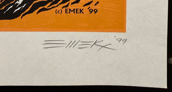 This is a rare Nine Inch Nails poster created by artist Emek for the Fragility 1.0 Tour in 1999. It was specifically made for the show at Columbiahalle in Berlin and is limited to just 75 prints. This 1st Edition poster measures approximately 14" x 34 " and has been hand-signed and doodled by Emek.