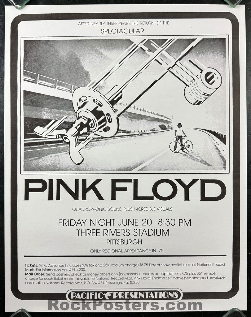 Take a look at this amazing Pink Floyd concert poster! It features their show in Pittsburgh, PA, at the Three Rivers Stadium on June 20, 1975. The concert was presented in quadrophonic sound. The poster measures approximately 17.5" by 22" and is in Near Mint Minus condition, with only minimal signs of handling.