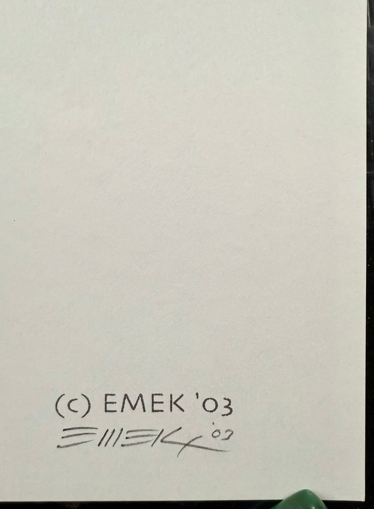 Here's an impressive poster from Queens of the Stone Age's 2003 performance at the Marquee Theatre in Jacksonville, Florida. This is the white variant edition, limited to just 20 copies. The poster measures approximately 30" x 20". You can find this image in "The Art of Modern Rock," listed as AoMR 0.48. Emek has signed and doodled this poster. Its condition is near mint with a handling bend.