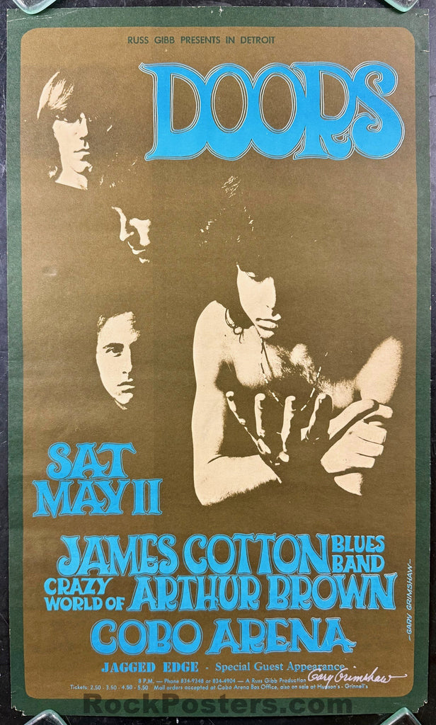 An original first-printing concert poster for The Doors, featuring their performance at the iconic Cobo Arena in Detroit, Michigan, on the night of Saturday, May 11, 1968. The opening acts included the James Cotton Blues Band and The Crazy World of Arthur Brown. This poster has been signed by the renowned Motor City graphic artist Gary Grimshaw in elegant silver pen.