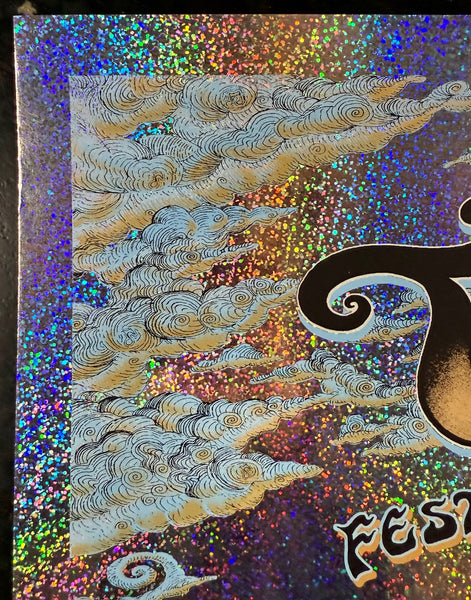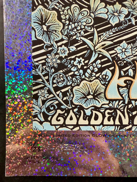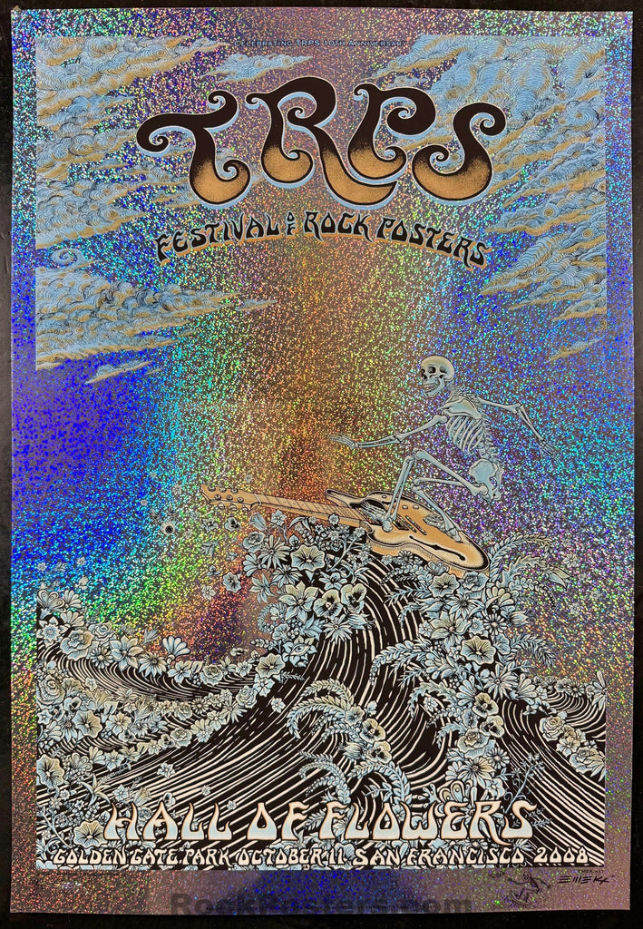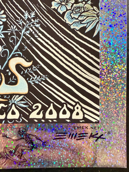 Emek's beautifully designed silkscreen poster for the 2008 TRPS event held at the Hall of Flowers in San Francisco. Emek created this limited edition print to raise funds for the Artist Relief Fund. This particular edition is a very rare sparkle foil variant. Only 25 copies were produced, and most of them are now buried deep within collections. The poster measures approximately 31" by 21.5". It has been signed, numbered, doodled, and embossed by Emek. The condition of the poster is near mint.