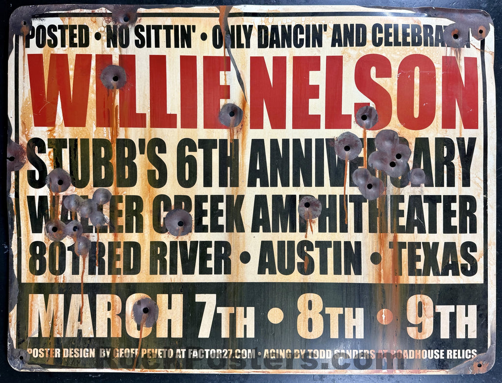 Here is an incredibly rare metal sign concert poster for Willie Nelson. The shows were held at the Walker Creek Amphitheater in Tin Auction, Texas, on March 7, 8, and 9, 2002, to celebrate Stubb's 6th anniversary. Joining him on the bill were Damnation and The Gourds.