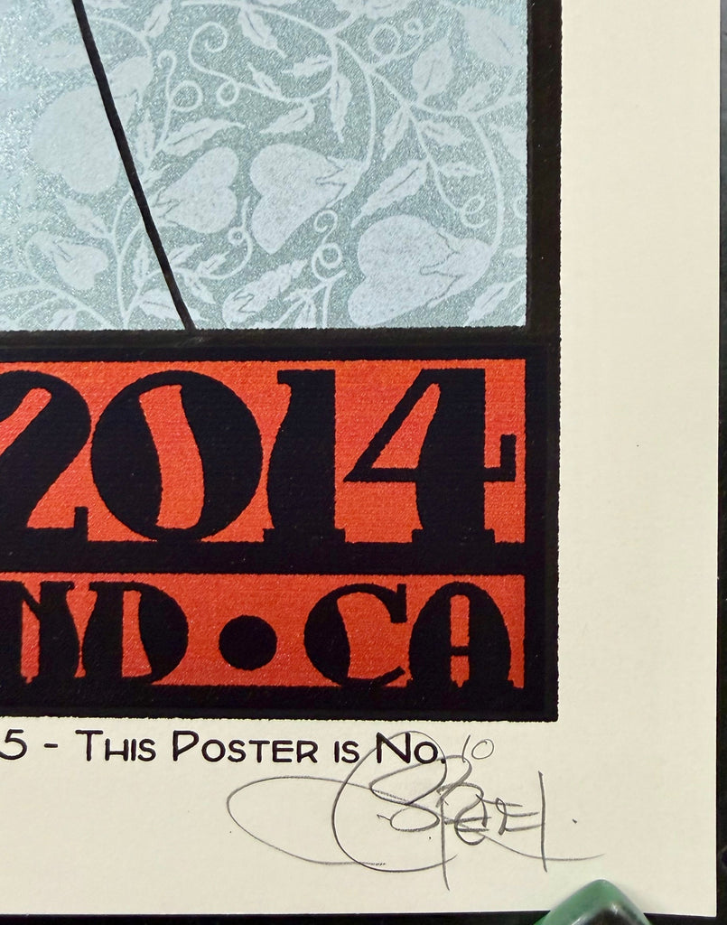 Here is Chuck Sperry’s elegant 7-color silkscreen for The Black Keys' performance at the Oracle Arena in Oakland, California, in 2014. This event was part of the Turn The World Blue tour, which took the band to various locations worldwide. Special guests during this tour included Jake Bugg, St. Vincent, and Cage the Elephant. The silkscreen measures 20 x 34” and is the first edition from a limited print run of 225 copies. Chuck has signed and numbered the print, and it is in mint condition.