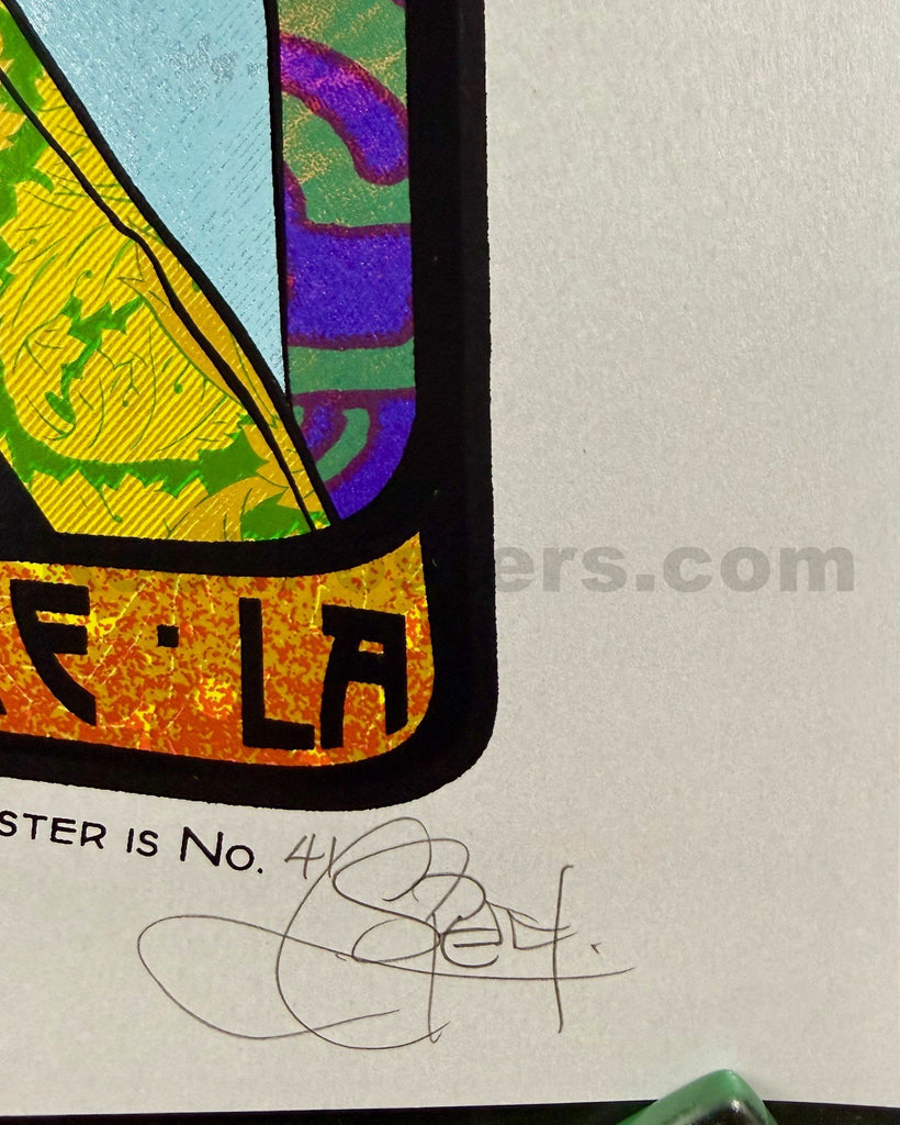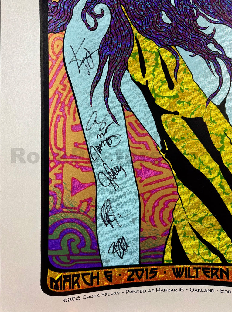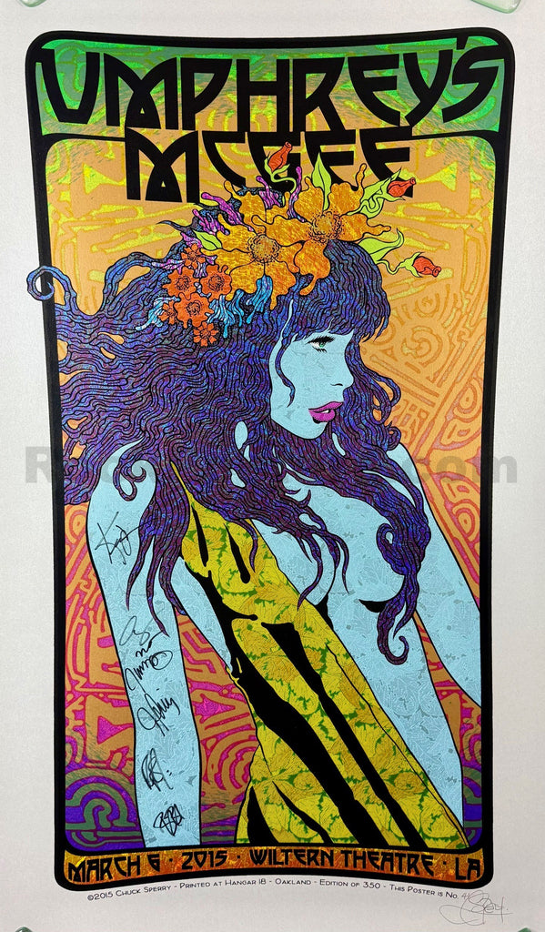 Here is Chuck Sperry's silkscreen poster for Umphrey's McGee's 2015 performance at the legendary Wiltern Theatre in Los Angeles, California. The band has signed this poster! There is a companion piece on the site for UM's show in Los Angeles the previous evening, which features a right-facing design. Both posters have matching numbers, making it a great opportunity to purchase both and complete a matching numbered set! This silkscreen measures 21” x 35.5” and comes from a limited print run of 350. Chuck has signed and numbered this edition, and its condition is mint.